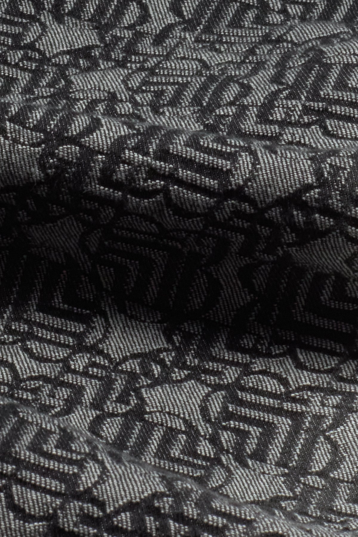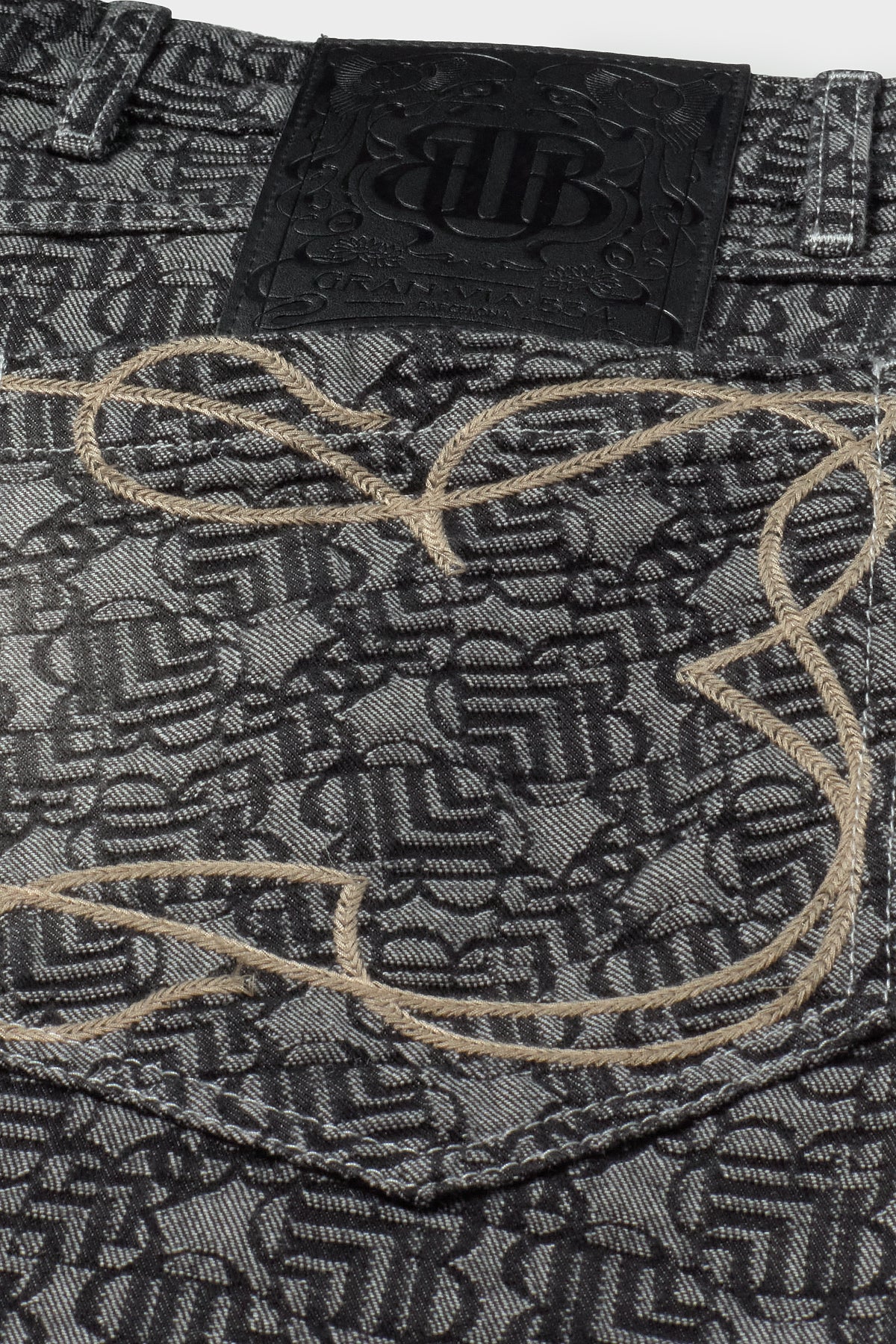 Mid-rise straight fit pants crafted in cotton denim jacquard with the brand's motifs pattern in low relief, a twisted leg seam that curves for a distinctive fit, and finished with a light washed effect along the sides of the leg. The garment features a modernist embroidery on both back pockets, the signature denim label on the back and the brand’s iconic buttons.