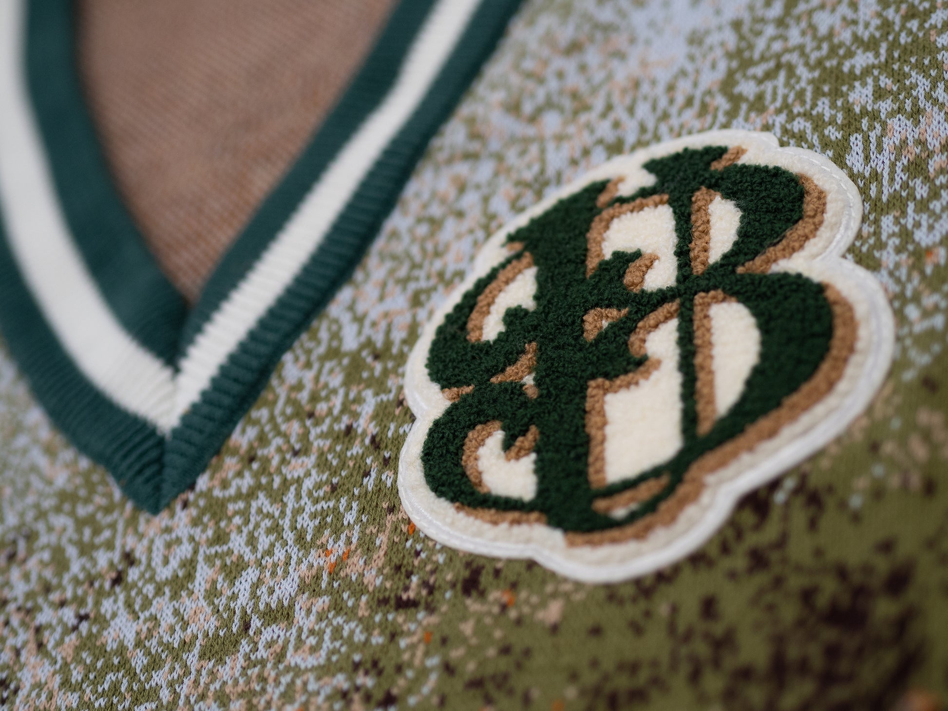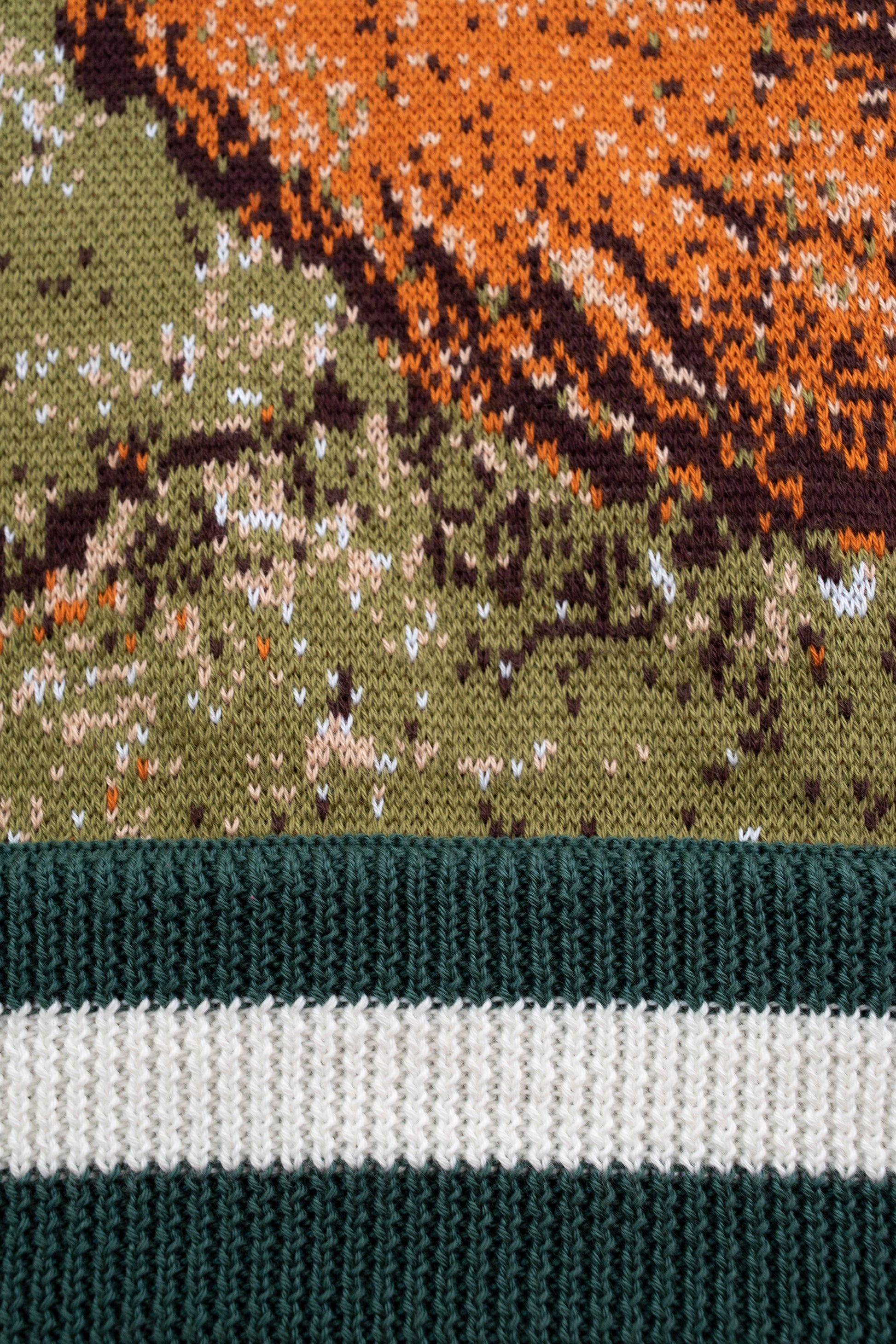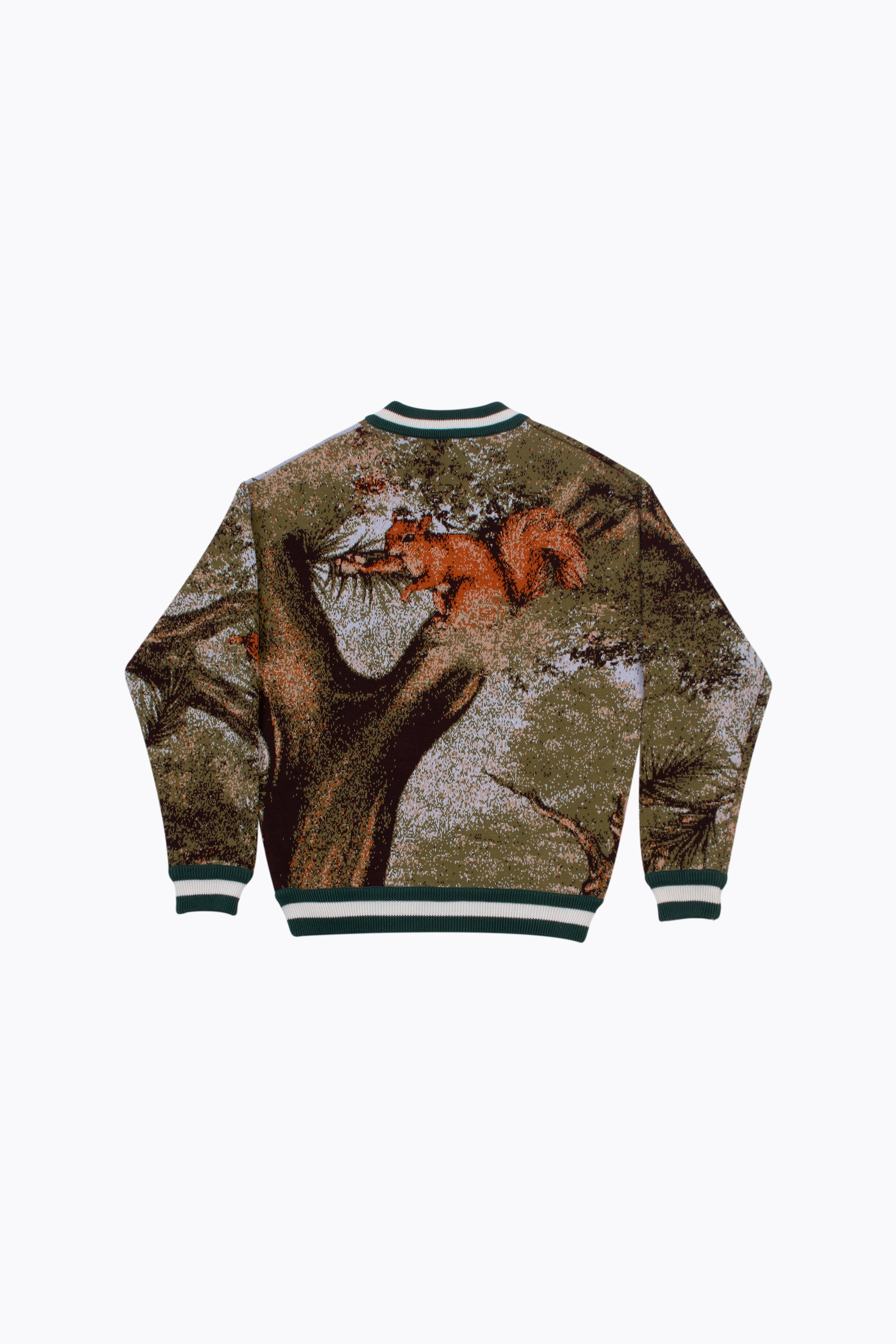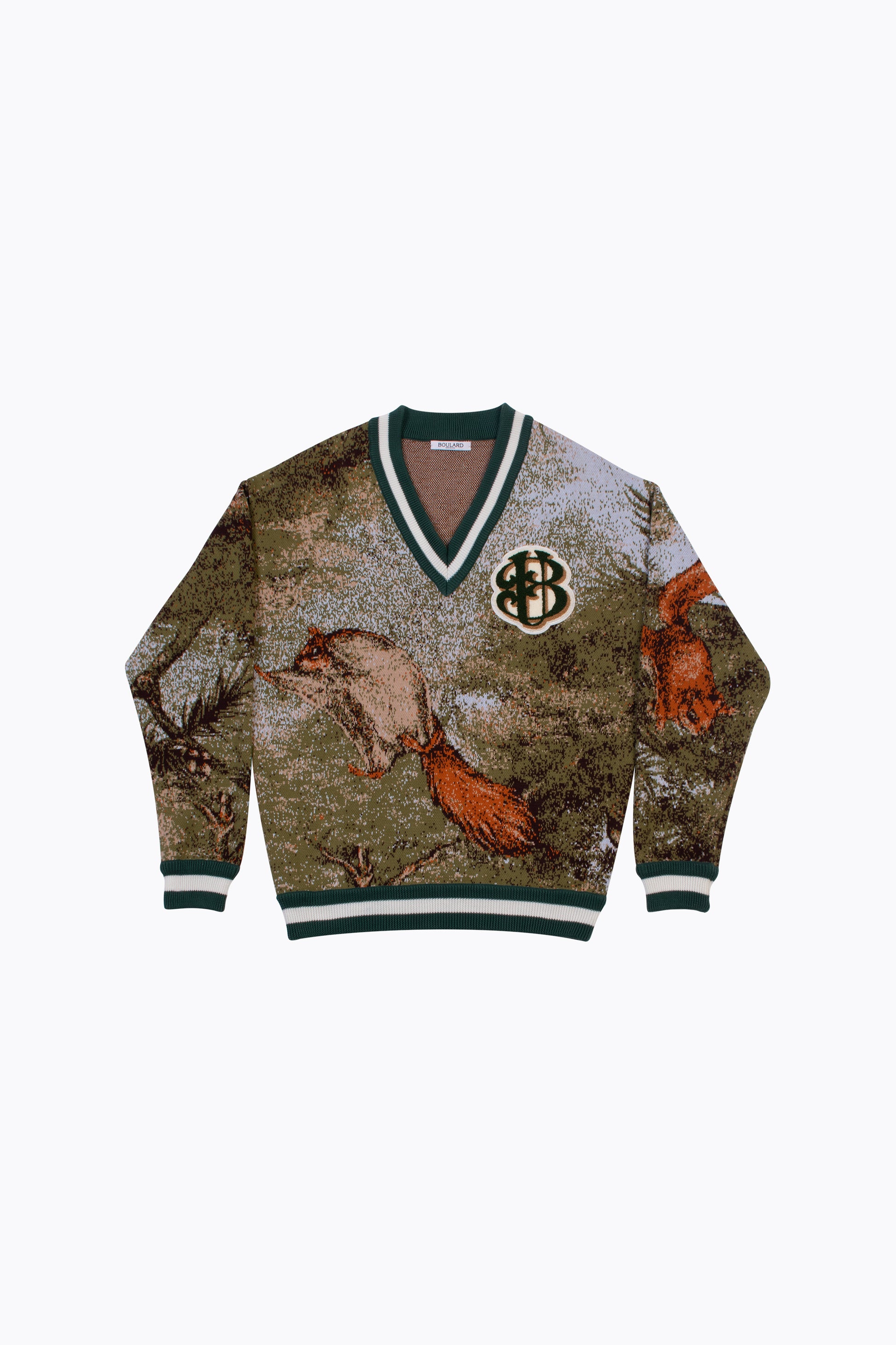 The L'Esquirolada sweater. An explosion of colorful yarns that make up this piece with the natural and Mediterranean theme of the capsule. With a preppy style, the sweater has been knitted in five colors and features the iconic squirrels. On the left side of the chest, it features a patch with the modernist capsule's UB logo. The entire check is embellished with these forest green and off-white ribbing woven into the body of the garment.