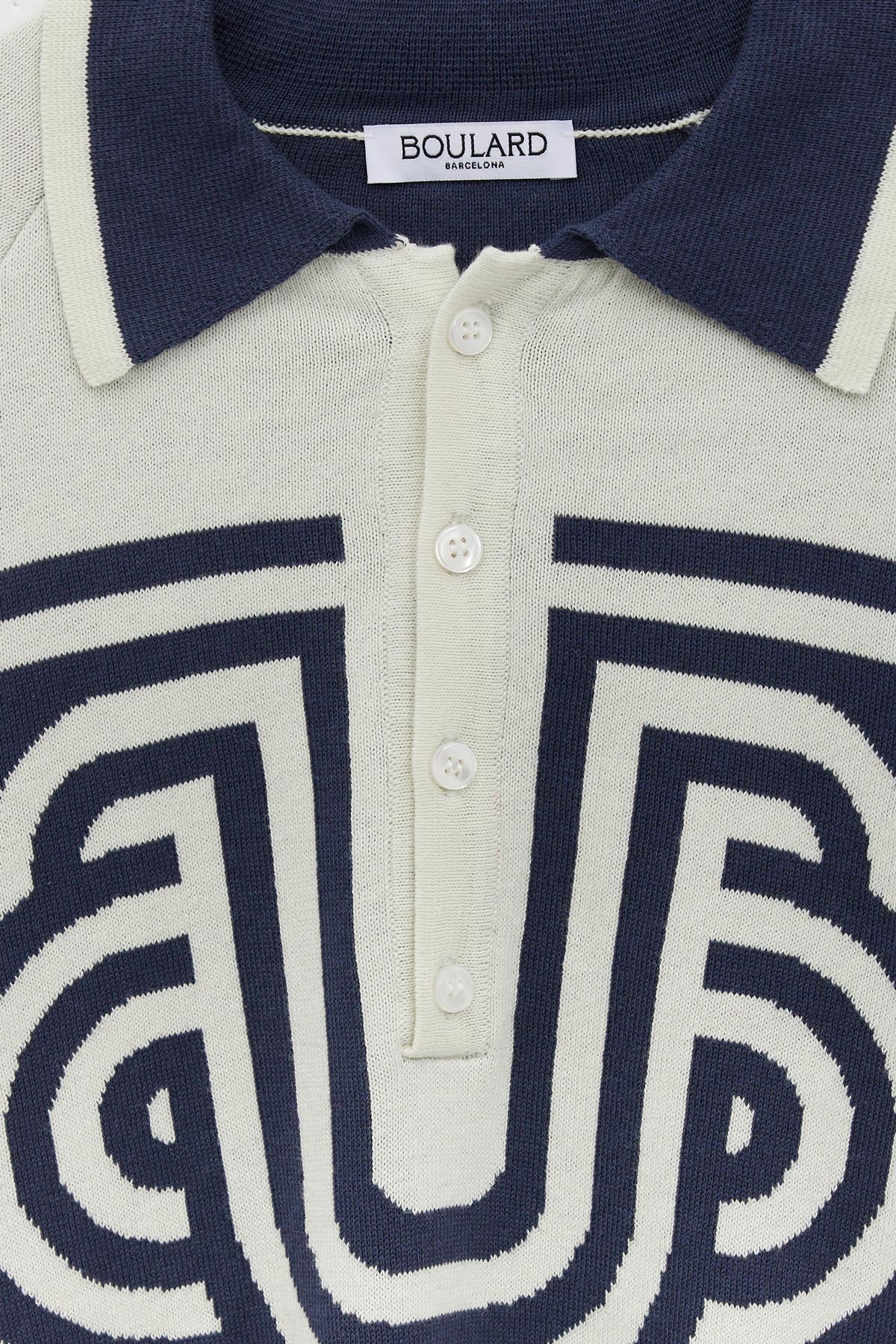 The polo shirt is by far the most iconic "Breton" piece, reinvented by UB for this collection. The combination of organic cotton and cashmere elevate this piece making it incredibly soft to the touch. This garment stands out for its special making, with the raglan sleeves and the collar with the traditional machine output marks. The tubular jacquard UB logo across the front and the pearlescent buttons give the piece a unique look while maintaining the essence of the traditional French “Marinière”.