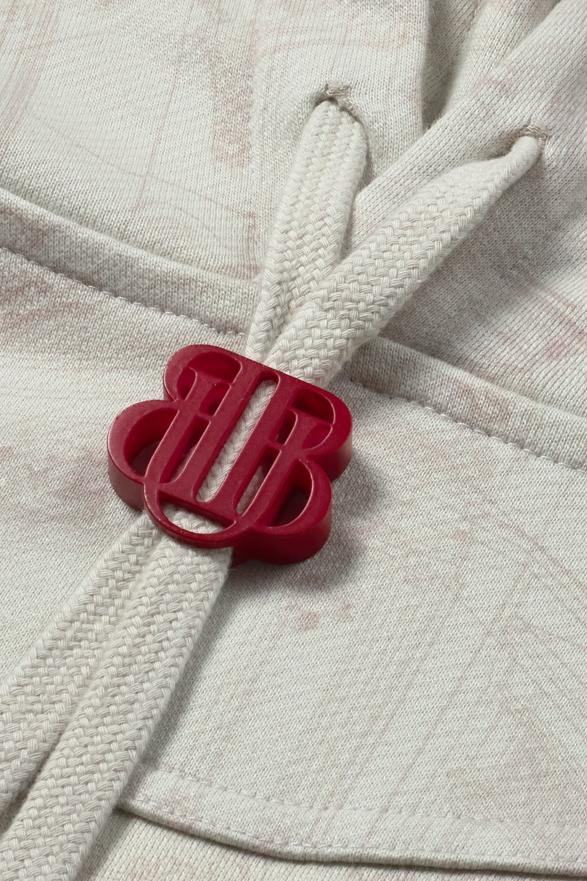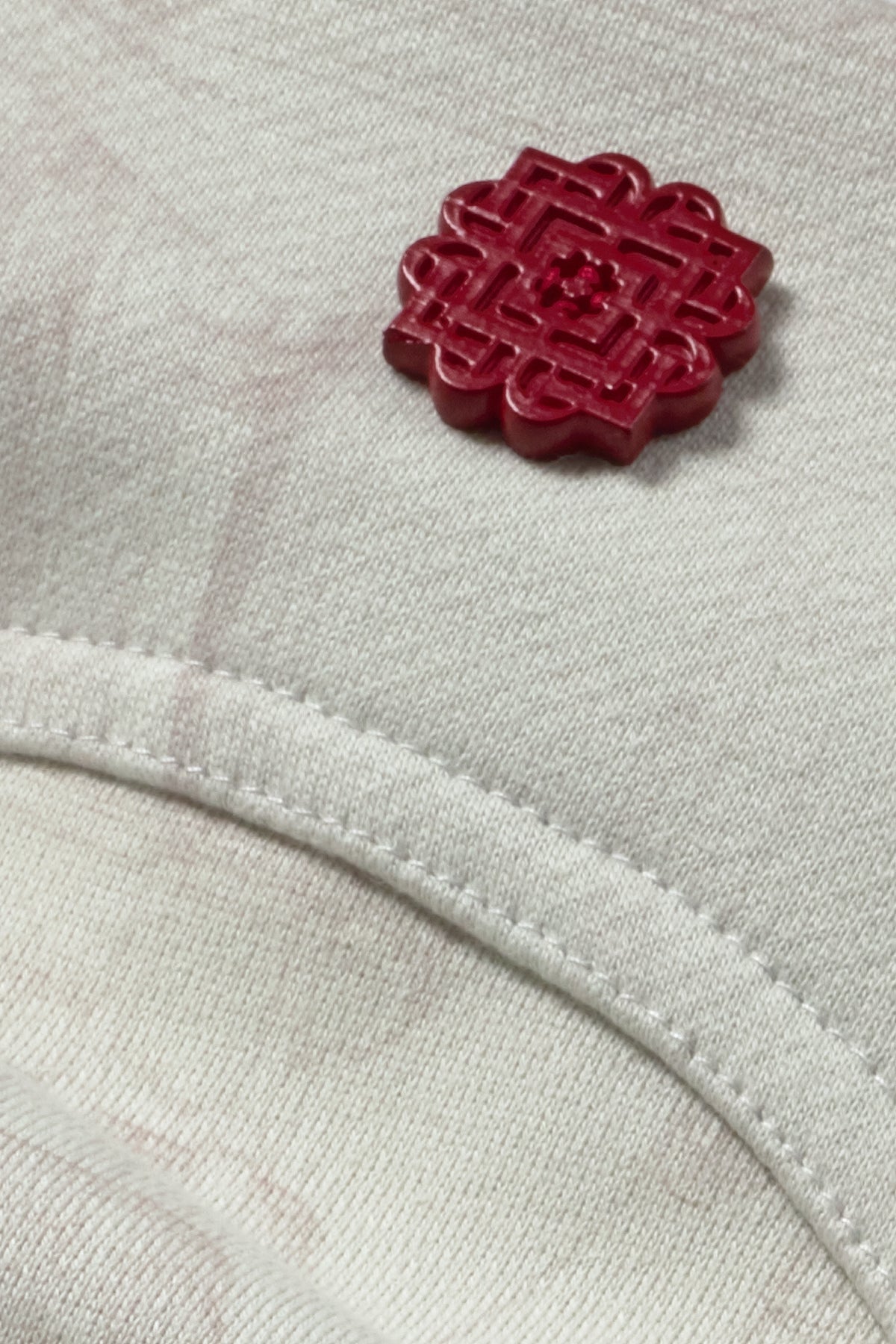 Oversized cotton tailored sweatshirt with a curved seam pattern and “japanese sleeves”. The garment features an all over print of sketches of Barcelona’s Modernist architecture, the new button design of the collection on the back, and a UB neck loop.