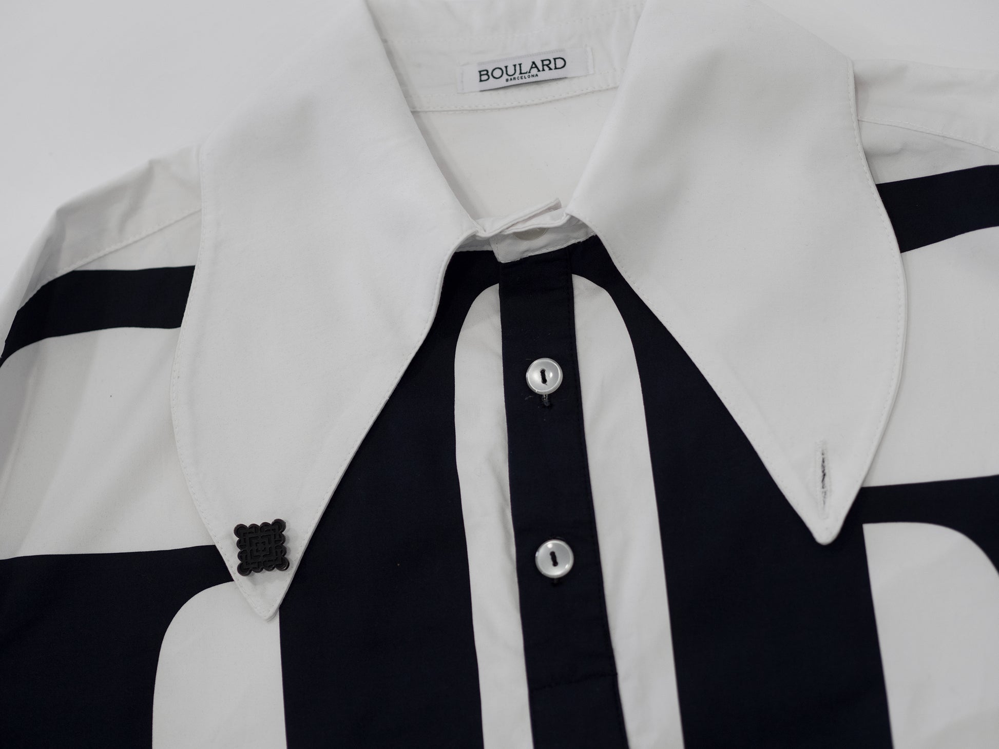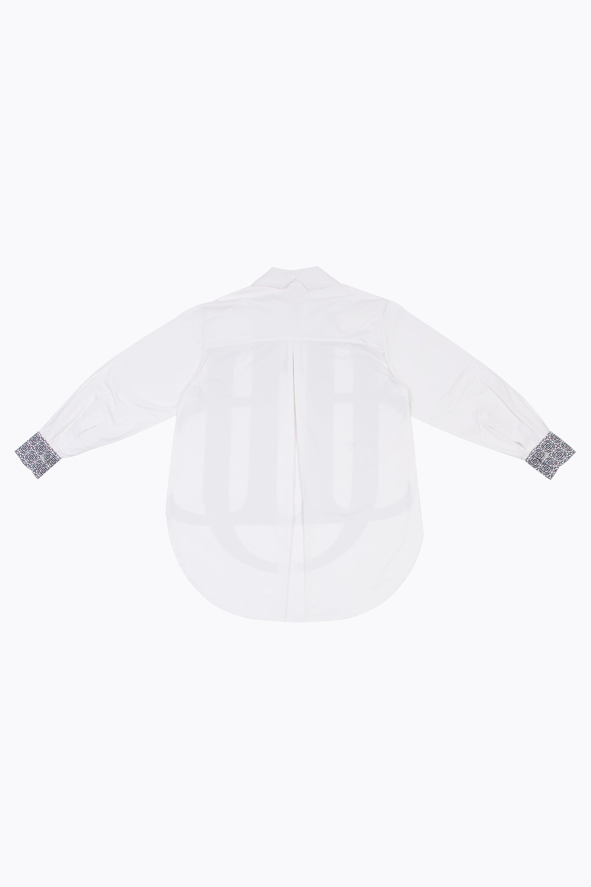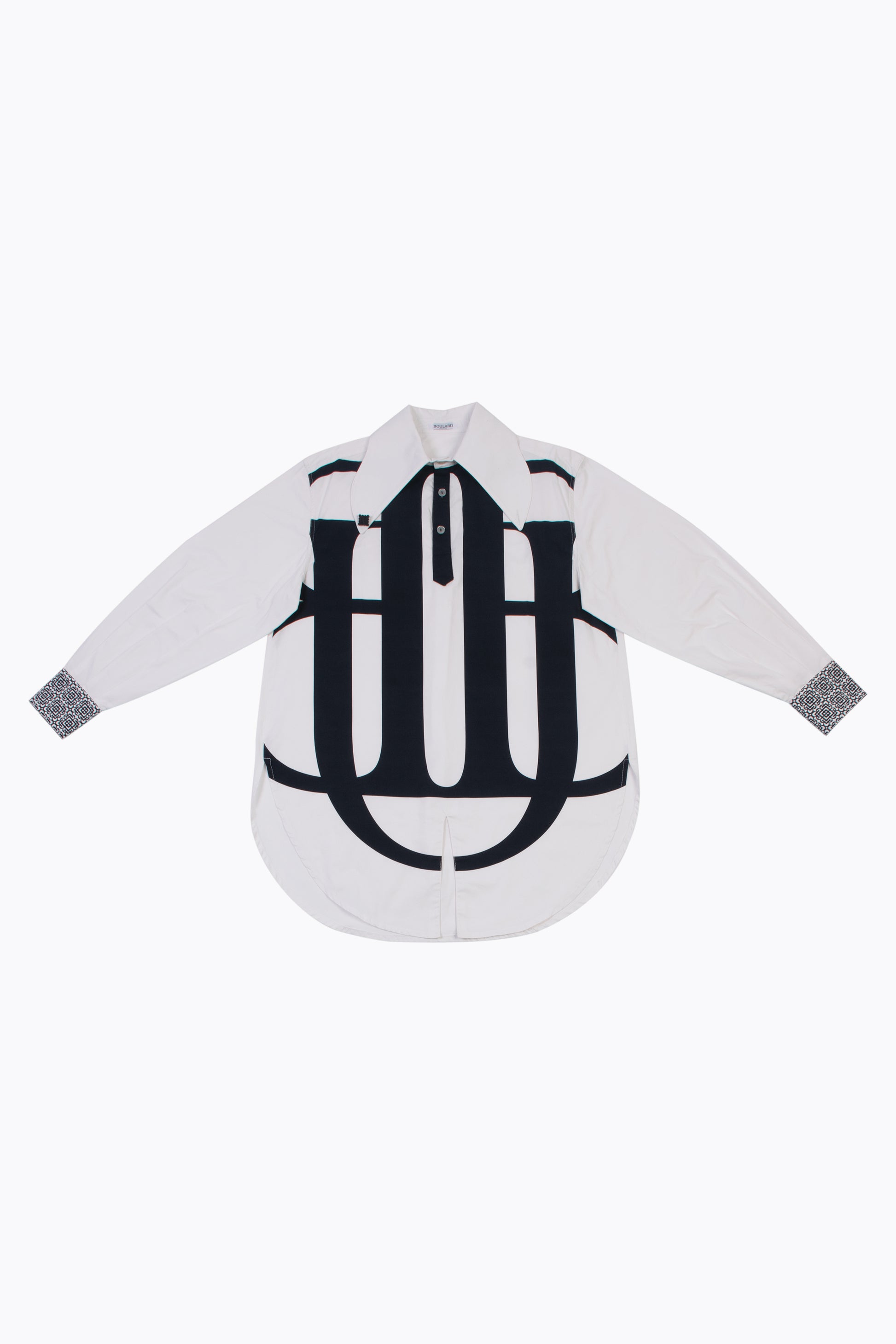 This is the brand's first iconic shirt. It drops a subtle three-quarter "royal" nightgown silhouette in a formal white and with the brand's logo print embracing the entire front of the garment. The front buttons create a small tie and the shirt introduces the most differential cut with the long wave-shaped collar when open. Thanks to the UB button on the collar, it can be deformed creating different shapes inspired by the old Renaissance collars shapes. The cuffs are printed with the brand's graphic pattern detail.