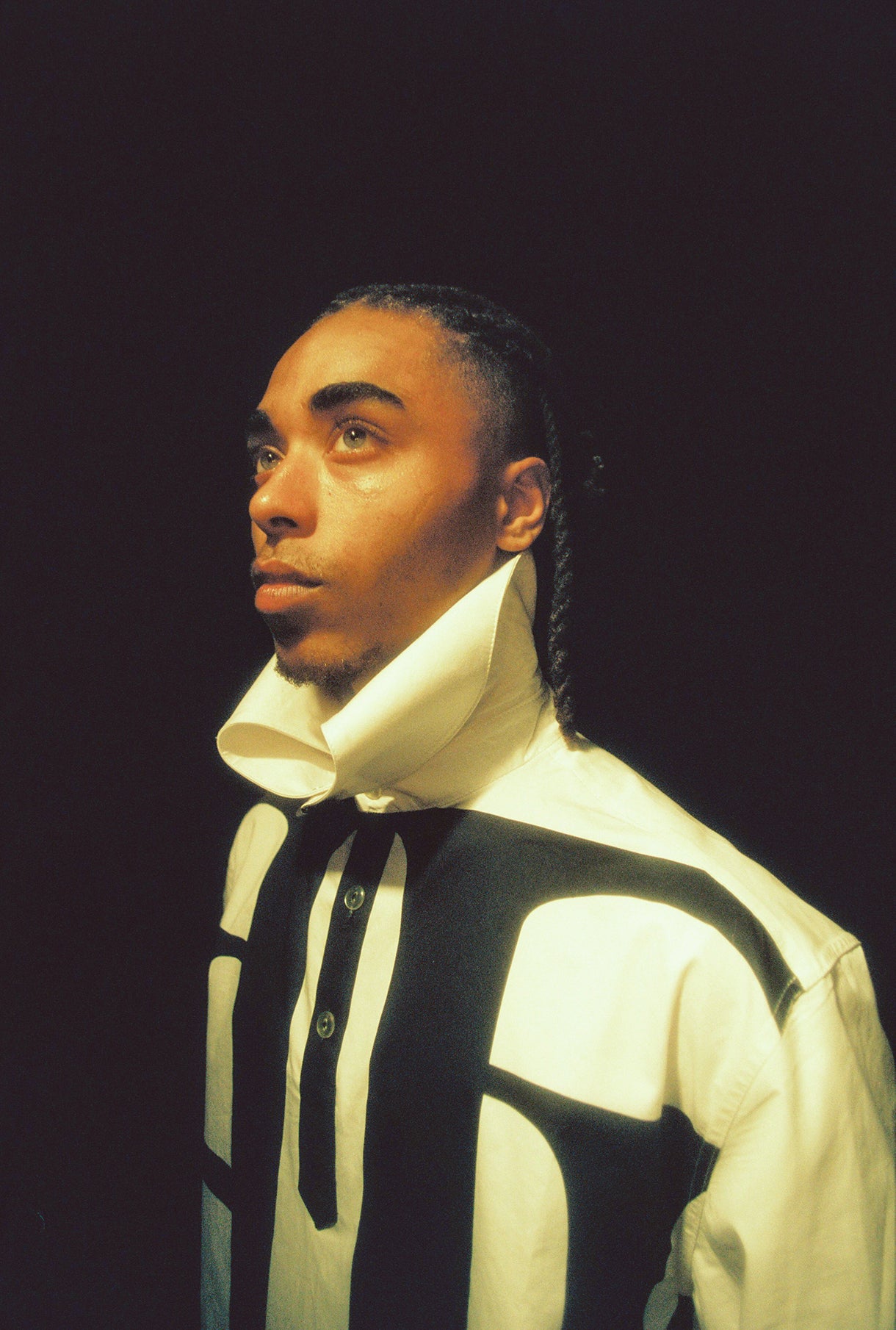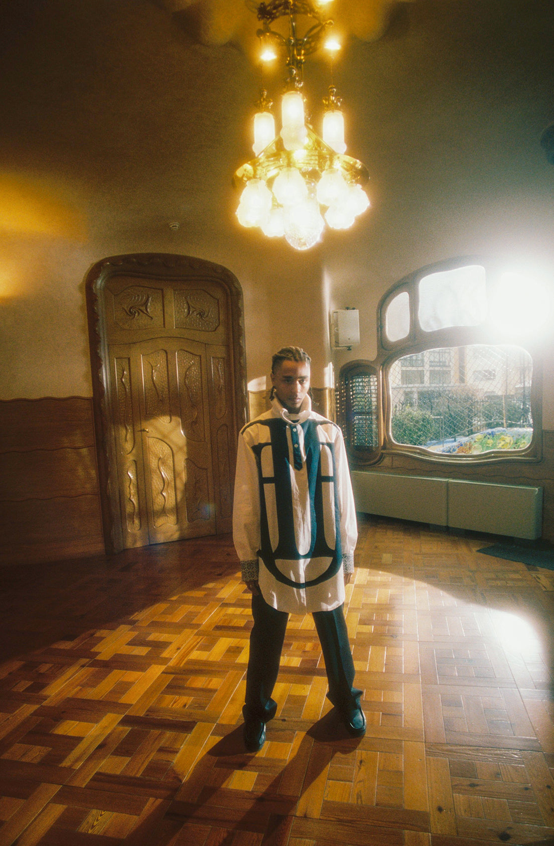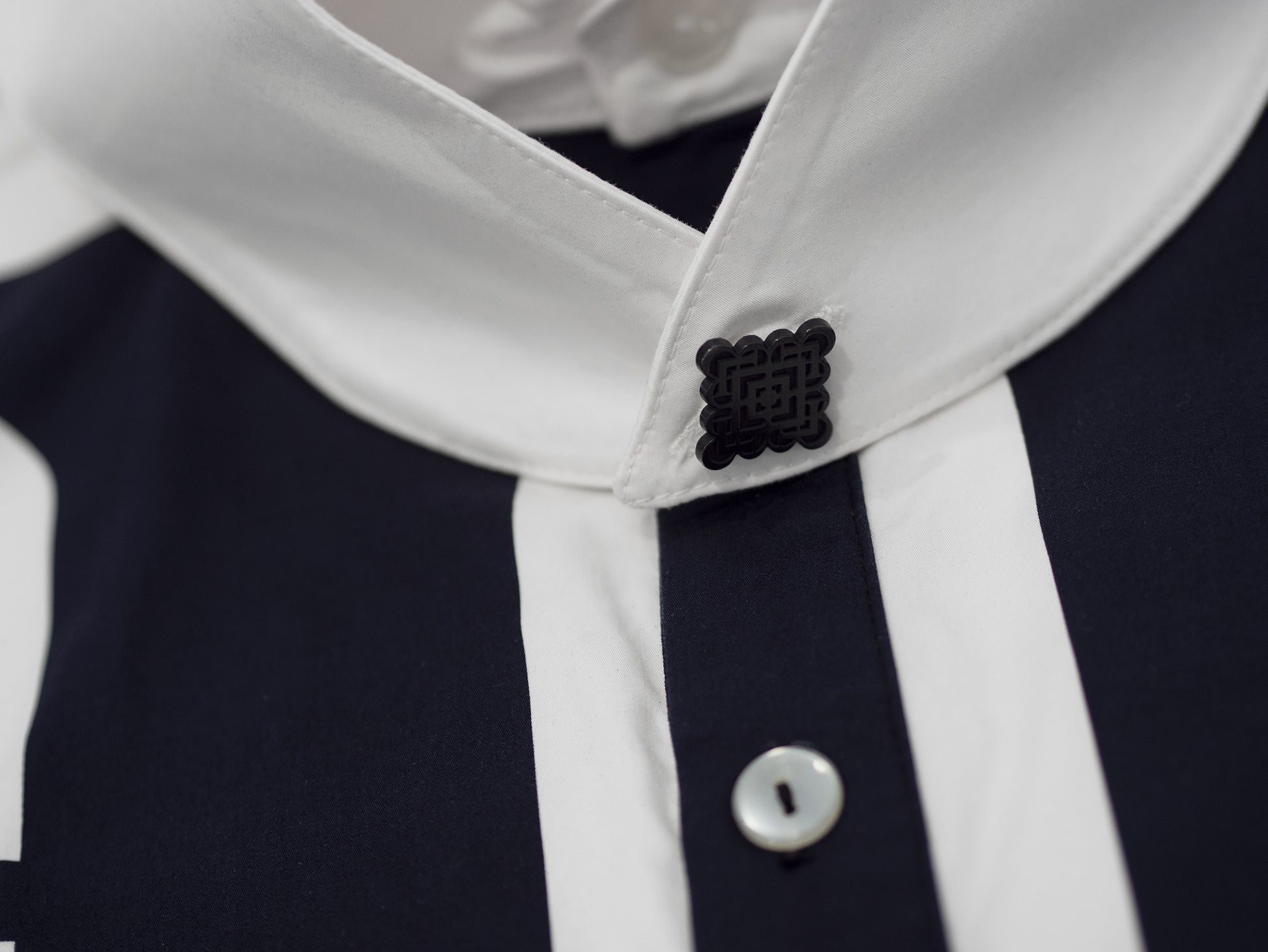 This is the brand's first iconic shirt. It drops a subtle three-quarter "royal" nightgown silhouette in a formal white and with the brand's logo print embracing the entire front of the garment. The front buttons create a small tie and the shirt introduces the most differential cut with the long wave-shaped collar when open. Thanks to the UB button on the collar, it can be deformed creating different shapes inspired by the old Renaissance collars shapes. The cuffs are printed with the brand's graphic pattern detail.