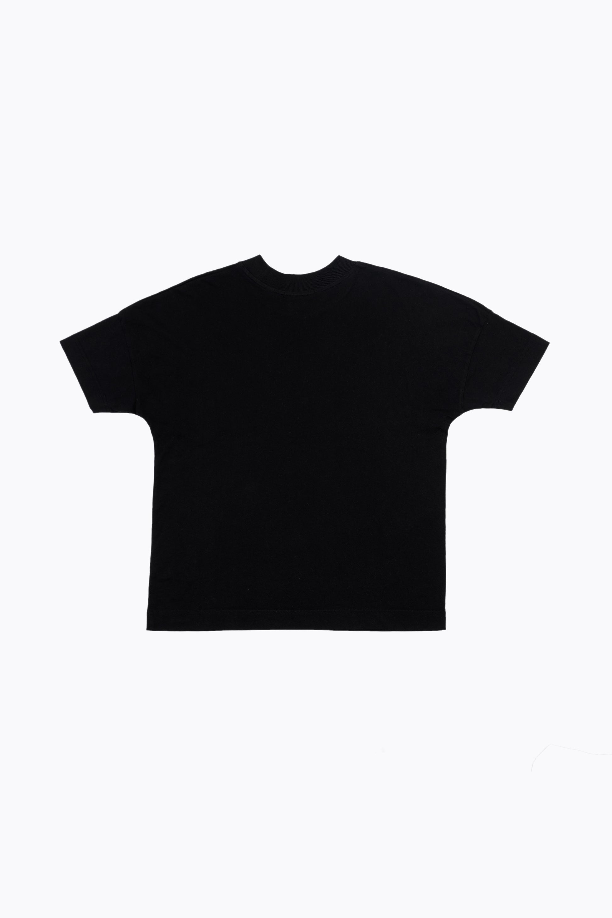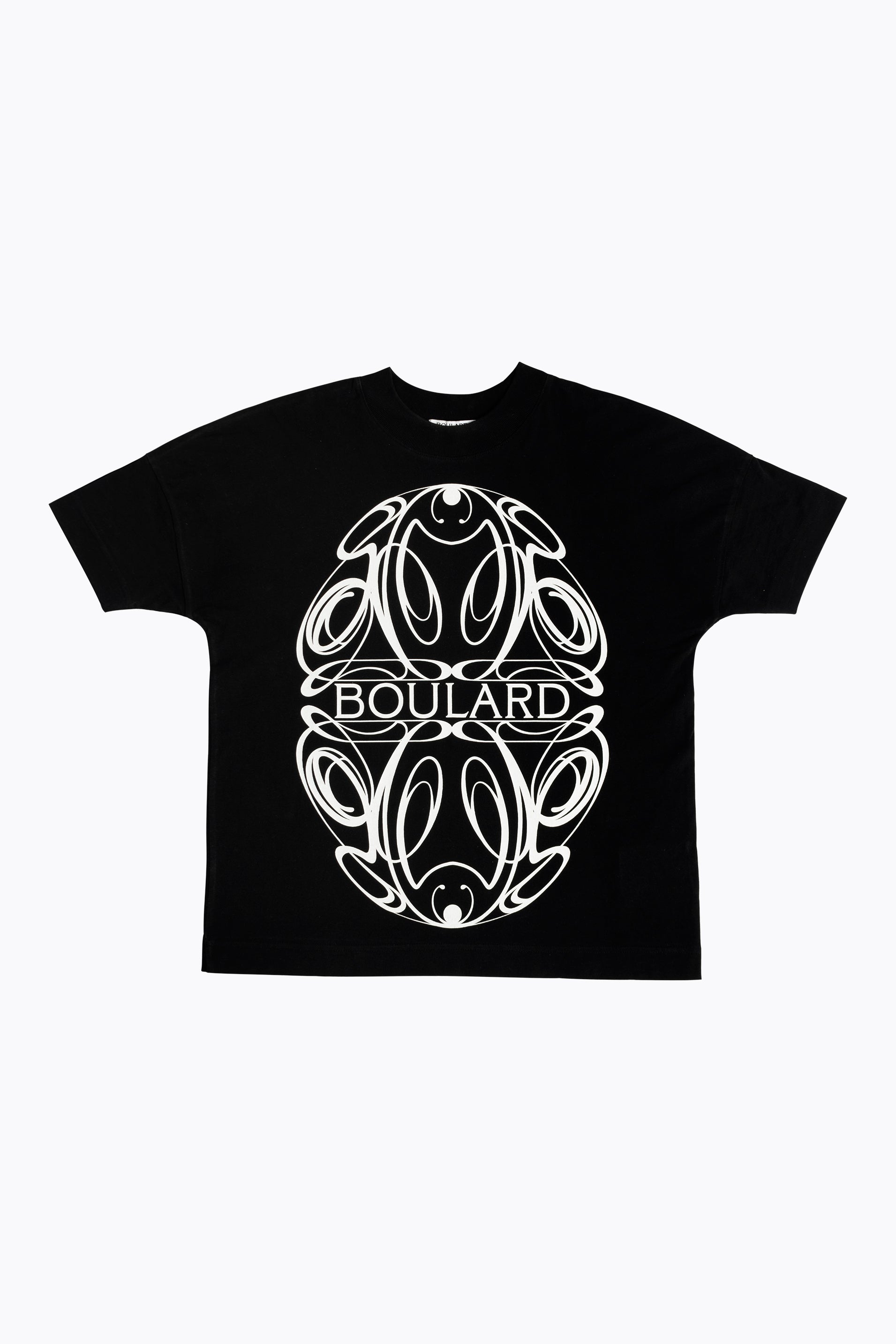 This T-shirt represents one of the basics of the collection. With a cut with tight sleeves and dropped shoulders, as well as this curious collar with a wide 1x1 rib and simple stitch. The silkscreen print of the T-shirt reinterprets the well-known "Fabergé Egg" in a Barcelona version created with different modernist ornaments and with the name of the firm falling in the middle of the piece.