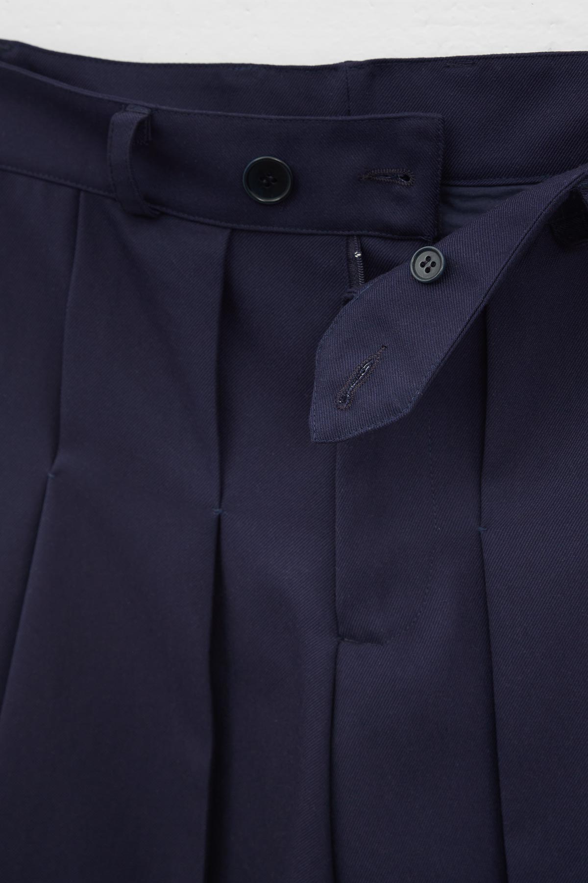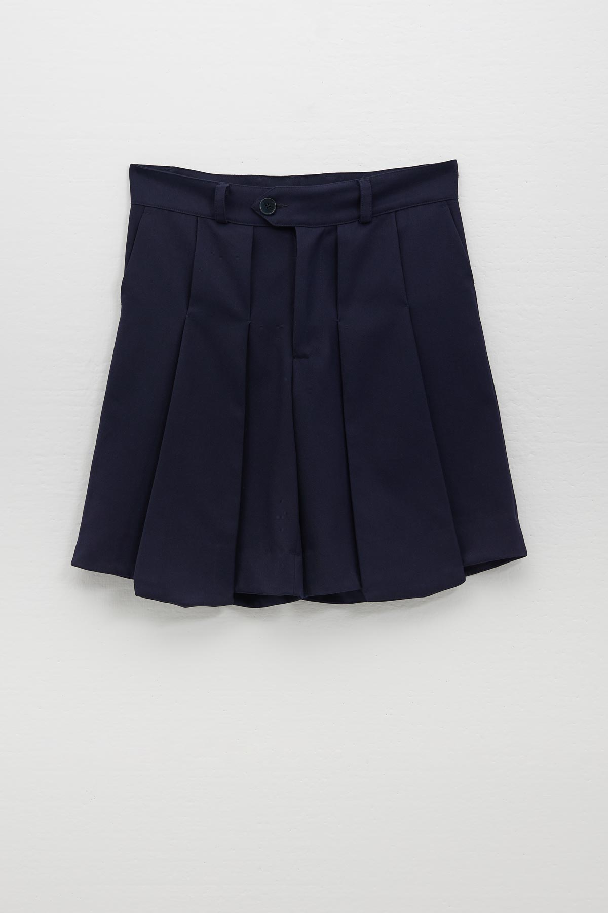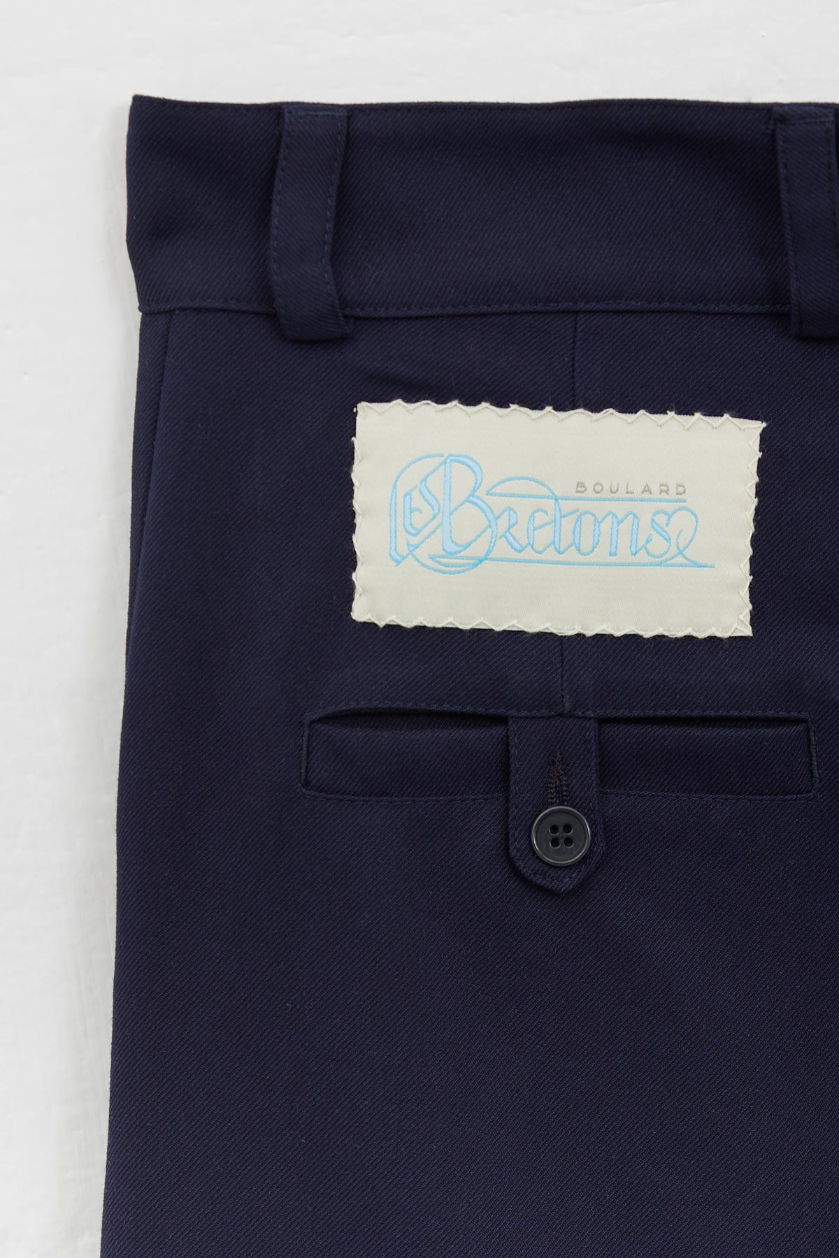 The main particularity of this bermuda pants is the frontal shape of a “trompe-l’oeil” skirt. The detail of the pleats with the two bar tack stitches, and the soft twill fabric, create the illusion of a drape that evokes the shapes of boat sails. In this piece, the crossover waistband is secured with an inside button and one meticulously placed outside, both made out of tagua nut. The collection label sits right on top of the back live pocket, and it is hand sewn with a double cotton thread in a sophisticated zig zag stitching.