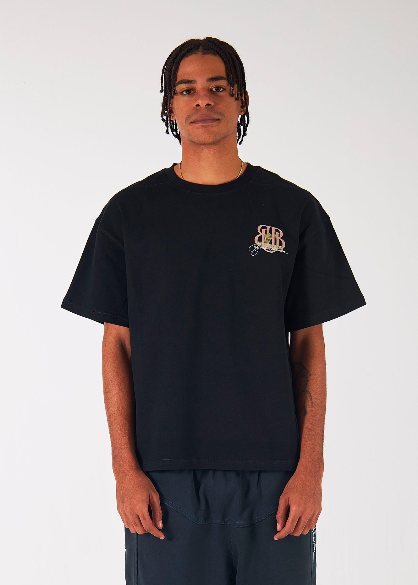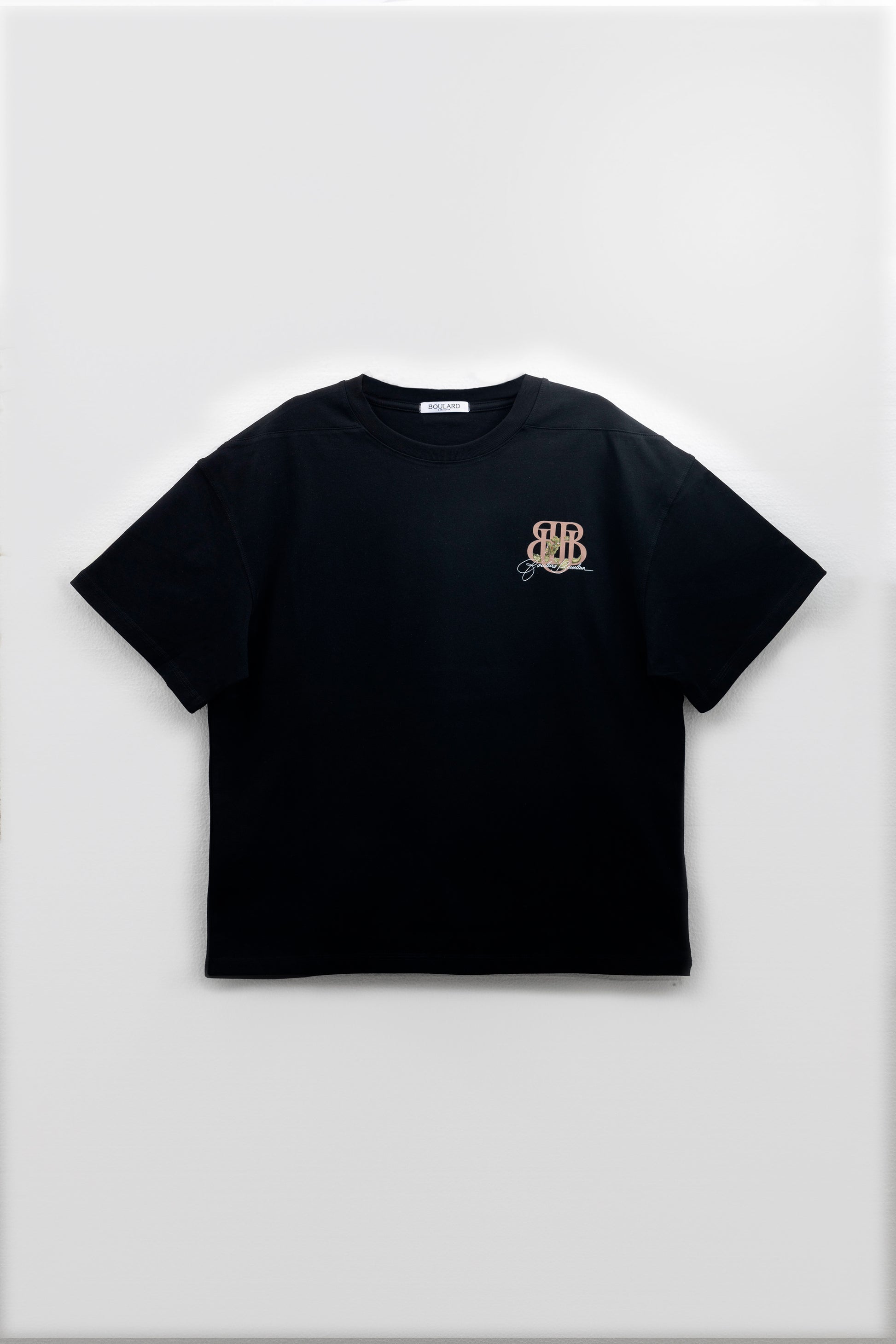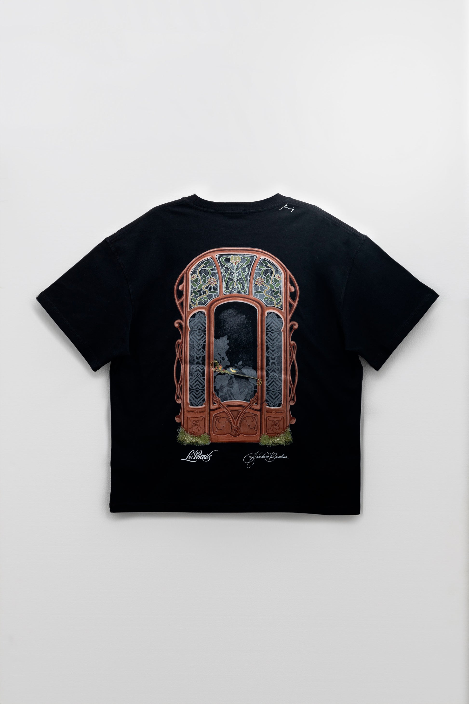 The capsule's "Les Portails" basic t-shirt features a distinct pattern and cut with cargo cuts from the neck to the shoulder, emphasizing clavicle aesthetics. Triple cargo seams create symmetry and elegance on the sleeves, hem, and shoulders. The front displays the logo and romantic flowers by painter Kenjiro Granados, along with the house's new signature. On the back, a modernist wooden portal reflects the capsule's dreamy ideal.