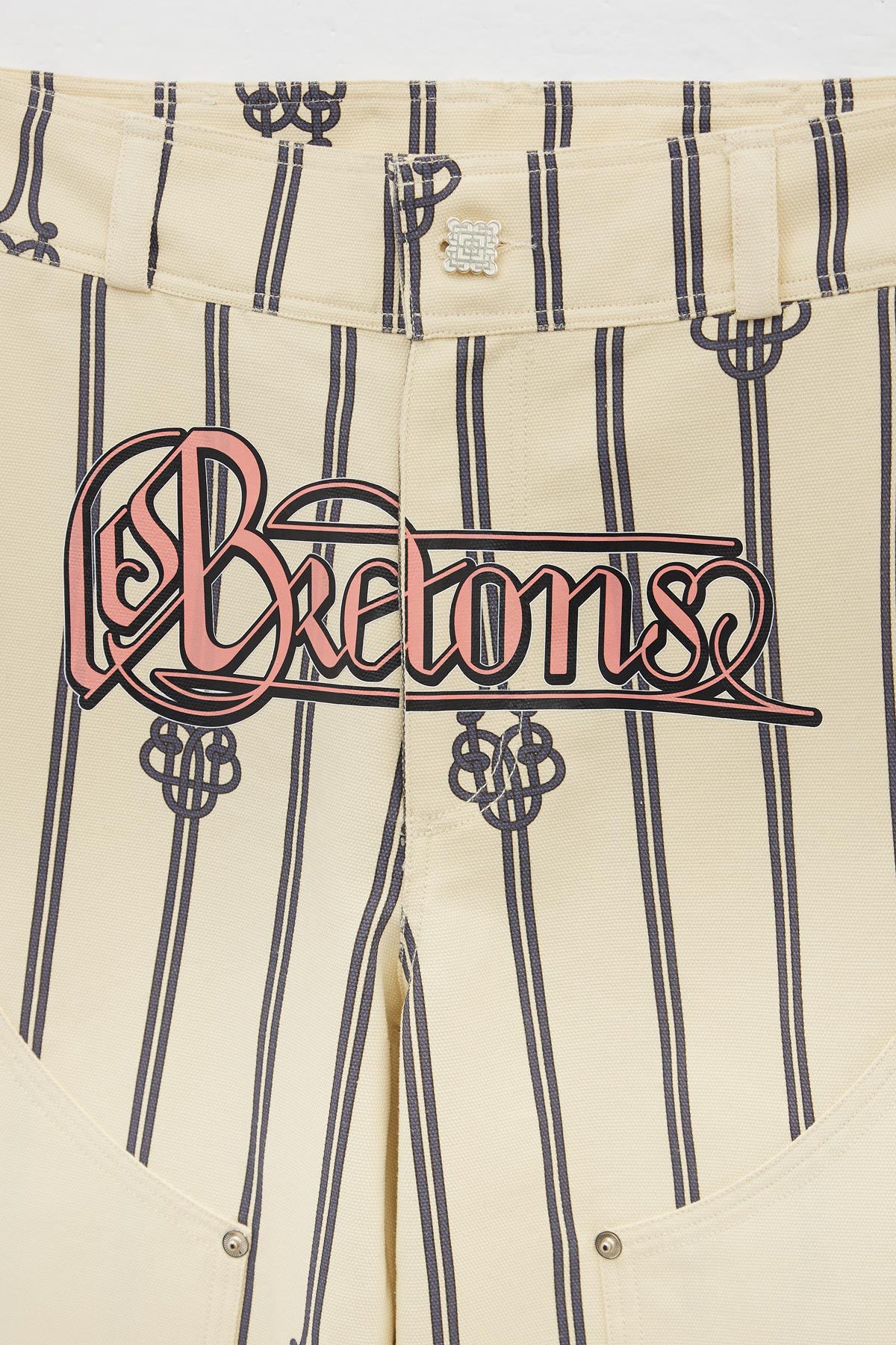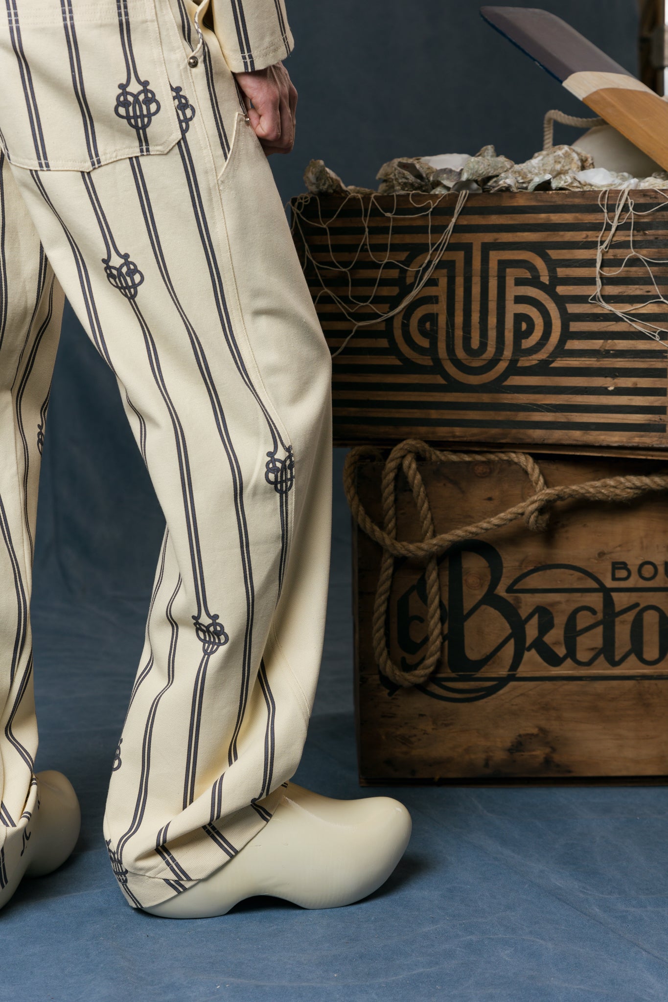These straight fit pants inspired by the humble workwear Breton sailors used to wear, are the outcome of an elaborate engineering and an impeccable graphic work. The special weave used to create this canvas fabric makes this pants extremely soft and fresh. From the classic UB twisted seam, to the bigger version of the monogram created from the shapes of sail boat ropes, this garment is a combination of special details carefully put together. In this particular piece we find the classic UB silver button, and also the collection label hand sewn with a double cotton thread in a sophisticated zig zag stitching. The most notorious addition to this garment is the color printing of the collection’s name on the front and the solid color double knee patches.